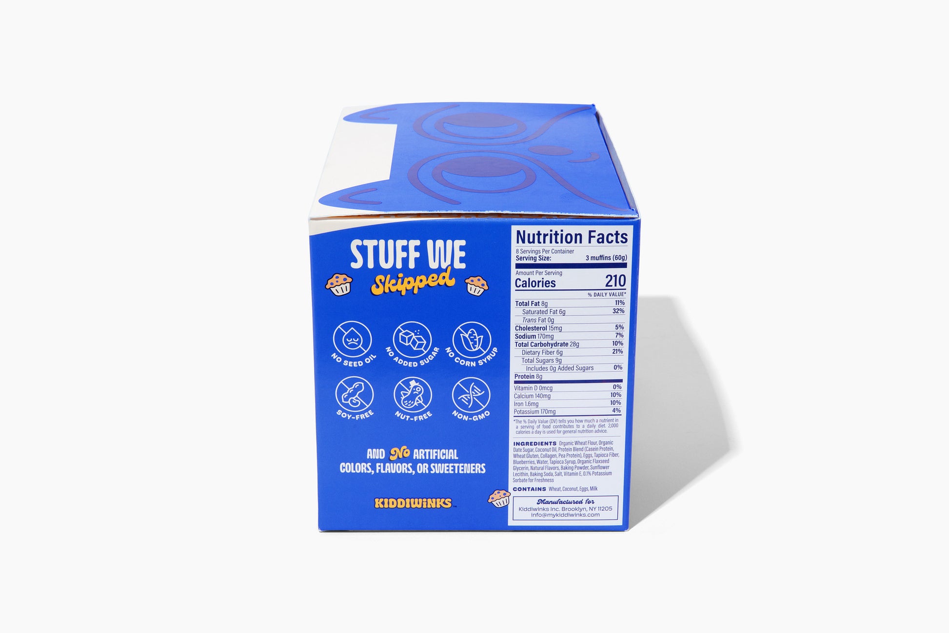 Delicious, fluffy blueberry muffins packed with protein and fiber, naturally sweetened with dates and real blueberries and no seed oil. Hand-crafted in small batches for a homemade taste. Healthier and more filling than anything you can find in the snack aisle while also tasting like a treat! 3 muffins per pack, 24 muffins per box.
